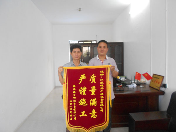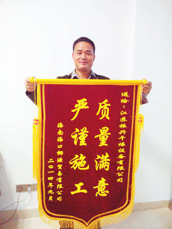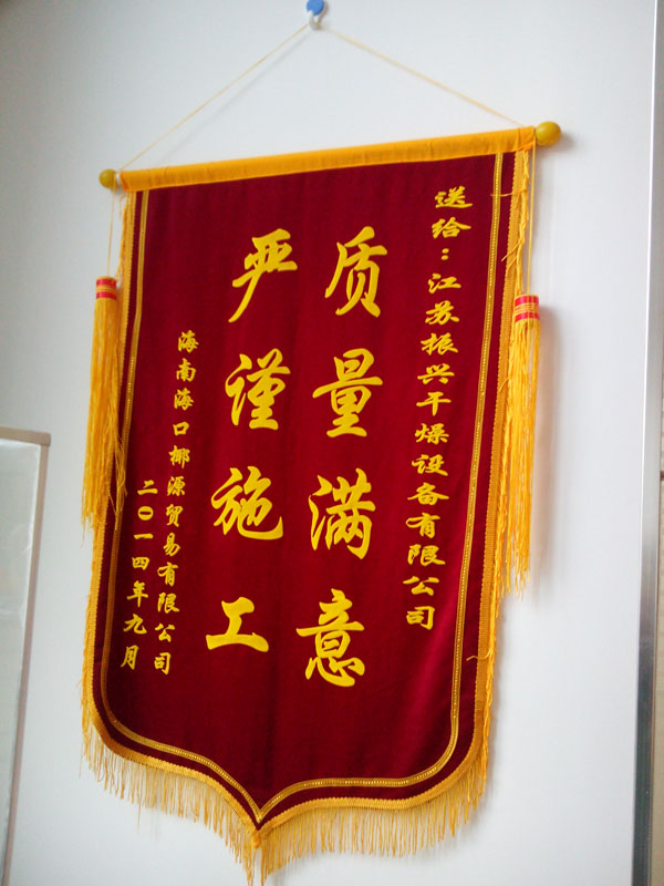 2014.9.24, Wei Guofang, an installation and debugging personnel, brought back a silk banner and handed a letter of thanks in the hands of the leadership, the banner above wrote "strict construction, satisfactory quality." This banner and these words express the customer's full affirmation and praise for our Zhenxing Drying. This is not only another recognition for our drying products and after-sales service, but also another great encouragement to our work ethic. We all staff must take this banner as a mirror often to remind ourselves, we have to do for each customer " Heart customers, Courteous service."
