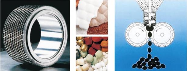 The roller type extrusion granulation is: the dry material is extruded into agglomerate (cake), and the cake material will be crushed and sieved and come out as granular material. The extrusion process is squeezed out the air from the particles and force the particle spacing close enough to produce such as van der Waals force, adhesive force, crystal bridge, and embedded connection suction force. The granules are mainly formed by the interaction between molecules.