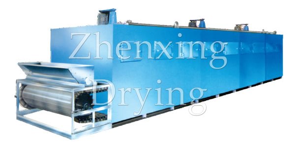 The raw material can be spread on the conveyor belt through suitable mechanism such as star distributor, vibrating belt, grinder or granulator. The conveyor belt will pass the channel that consist one or several drying units. Each drying unit is equipped with air heating and circulating system, and each drying unit has one or several dehumidification system. The hot air will move up and down when the conveyor belt passes though.